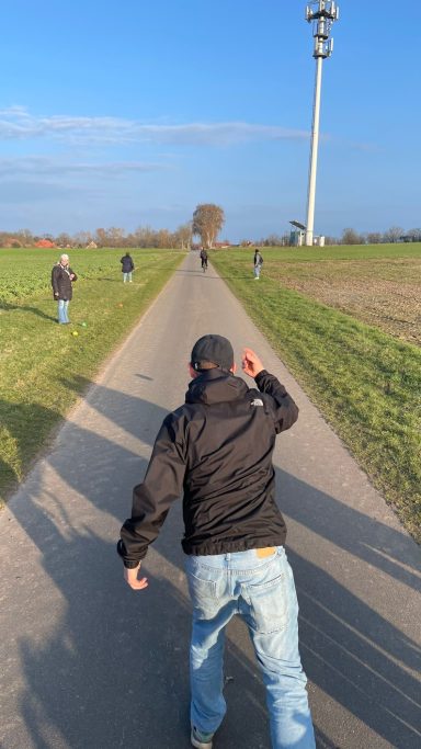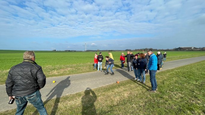 Am Samstag hat der Förderverein der FFW das Boßeln nachgeholt (wurde wegen schlechtem Wetter verschoben). Marlies und Dieter Jaehnke übernahmen die Planung und kümmerten sich um die nötige Versorgung, die in zwei Bollerwagen transportiert wurden. Gestartet wurde um 13:00 Uhr am Treffpunkt hinter der Leinebrücke. Es wurden 4 Teams (gelb, rot, grün, orange) mit je 5 Spielern ausgelost.